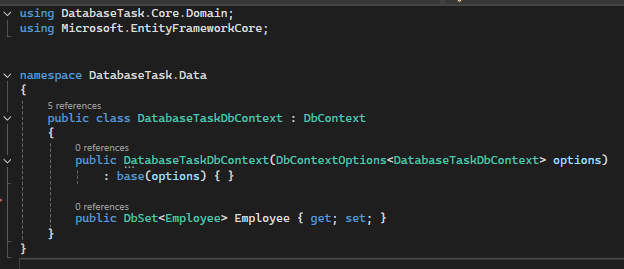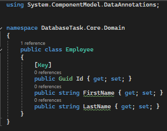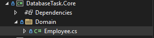 Teed Employee.cs klassi domaini alla mis on DatabaseTask.Core all