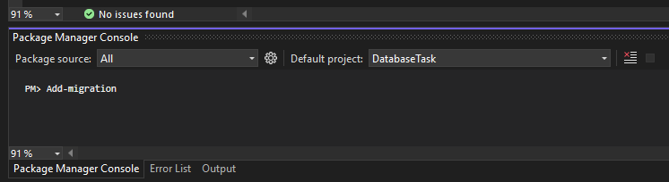 Scaffold-DbContext “Server=localhost\SQLEXPRESS;Database=DatabaseTaskDb;Trusted_Connection=True;TrustServerCertificate=True;” Microsoft.EntityFrameworkCore.SqlServer -OutputDir dbFirst