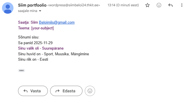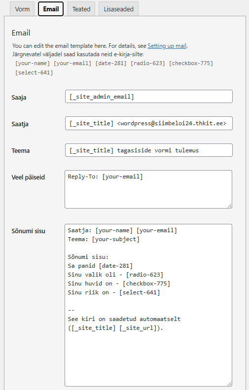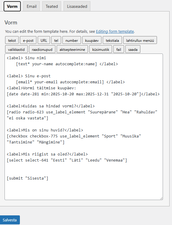 Kontaktvormi plugin Sinu nimi Sinu e-post Vormi täitmise kuupäev: Kuidas sa hindad vormi? SuurepäraneHeaRahuldavei oska vastata Mis on sinu huvid? SportMuusikaTantsimineMängimine Mis riigist sa oled? EestiLätiLeeduVenemaa Δ Kuidas vormi kood välja näeb? Millised vormi seadistused on tehtud Mis kiri tuli e-postile